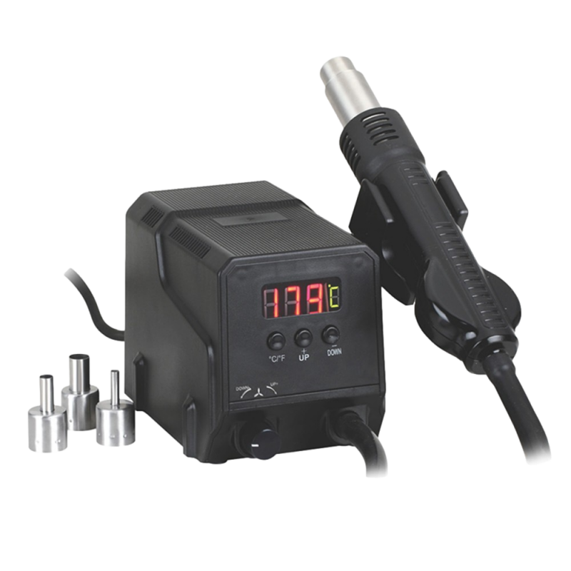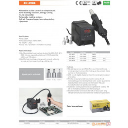 Die digitale Heißluftstation ZD-8908 eignet sich perfekt für die einfache Montage und das Auslöten von SMD-Bauteilen im Heißluftverfahren und kann auch als Heißluftgebläse zum Schrumpfen von Schrumpfschläuchen verwendet werden. Mit einer Leistung von 300 W kann sie innerhalb von 60 Sekunden auf 400 °C erhitzen. Die Temperatur lässt sich mit zwei Tasten einfach zwischen +100 °C und +500 °C einstellen, so dass das Gerät für verschiedene Aufgaben eingesetzt werden kann. Die Sensoren und der Mikrocontroller sorgen für eine korrekte und stabile Temperatur und die Luftmenge kann mit dem Drehregler auf bis zu 120 l/min eingestellt werden. Das große Display mit Temperaturanzeige macht es einfach, während der Arbeit den Überblick zu behalten und der seitlich angebrachte Halter garantiert eine sichere Aufbewahrung der Heißluftdüse. Wenn die Düse in den Halter gelegt wird, schaltet die Station in den Standby-Modus, um Energie zu sparen. Diese nützlichen Eigenschaften machen die ZD-8909 zu einem nützlichen Werkzeug für Profis und Anfänger, die eine zuverlässige Heißluftstation benötigen.