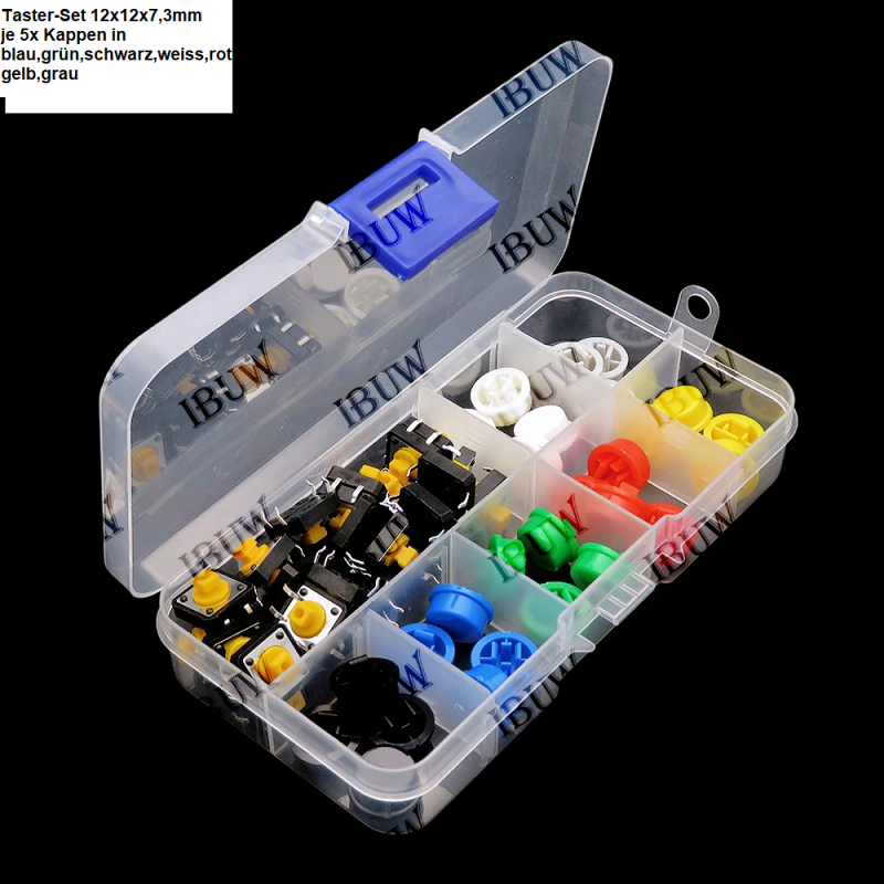 Print-Taster Set bestehend aus 30x Print-Taster 12x12x7,3mm und 30x Tastkappen (je 5x rot,blau,gelb,schwarz,weiss,grau)
