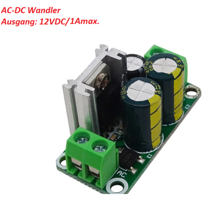 Bestückt mit Brückengleichrichter und Spannungsregler 12V und 1A Typ. Zwei 470uf filterung Elko`s zum Filtern und eine 220uF Kondensator am Ausgang.